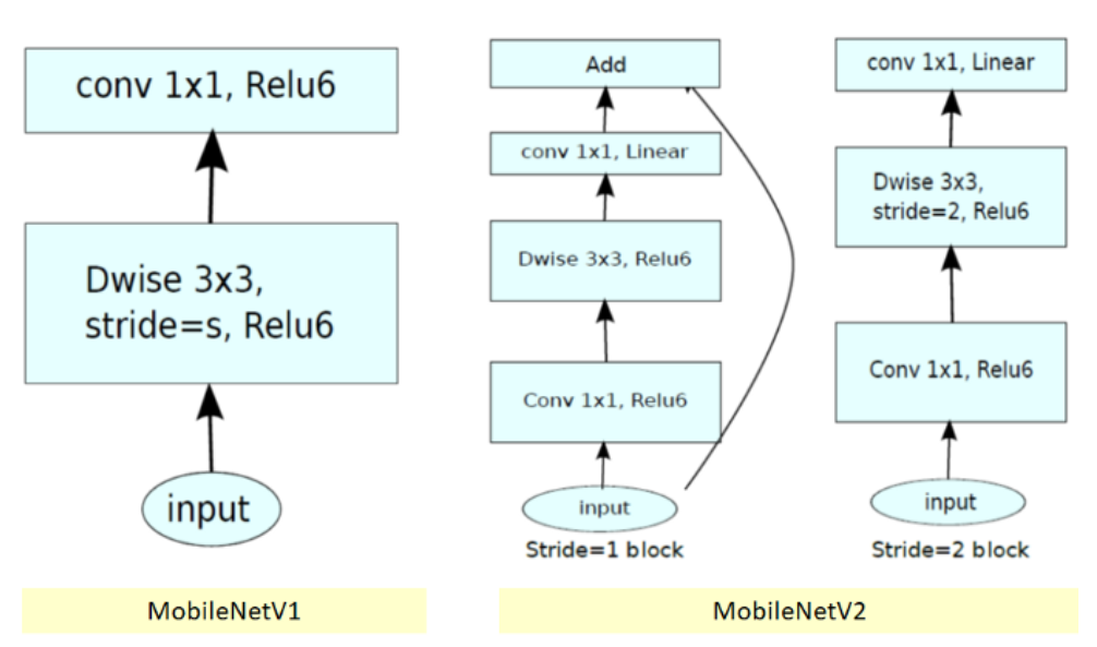 - 두 block 모두 첫 번째 layer는 pointwise(1x1) convolution + ReLU6