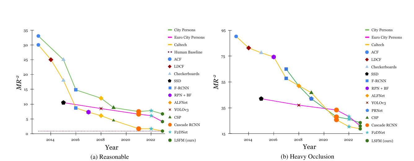 - 특이사항: LSFM은 보행자 감지 역사상 처음으로 인간 기준 성능을 능가함.