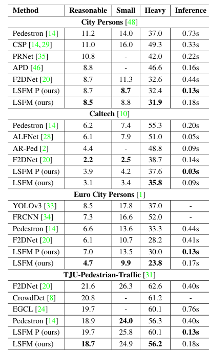 - Tab. 7 및 Tab. 8: City Persons 및 Euro City Persons 데이터셋에서 LSFM의 성능 - City Persons에서 이전의 최첨단 방법들을 뛰어넘는 성능 기록, Euro City Persons에서는 약간의 성능 저하