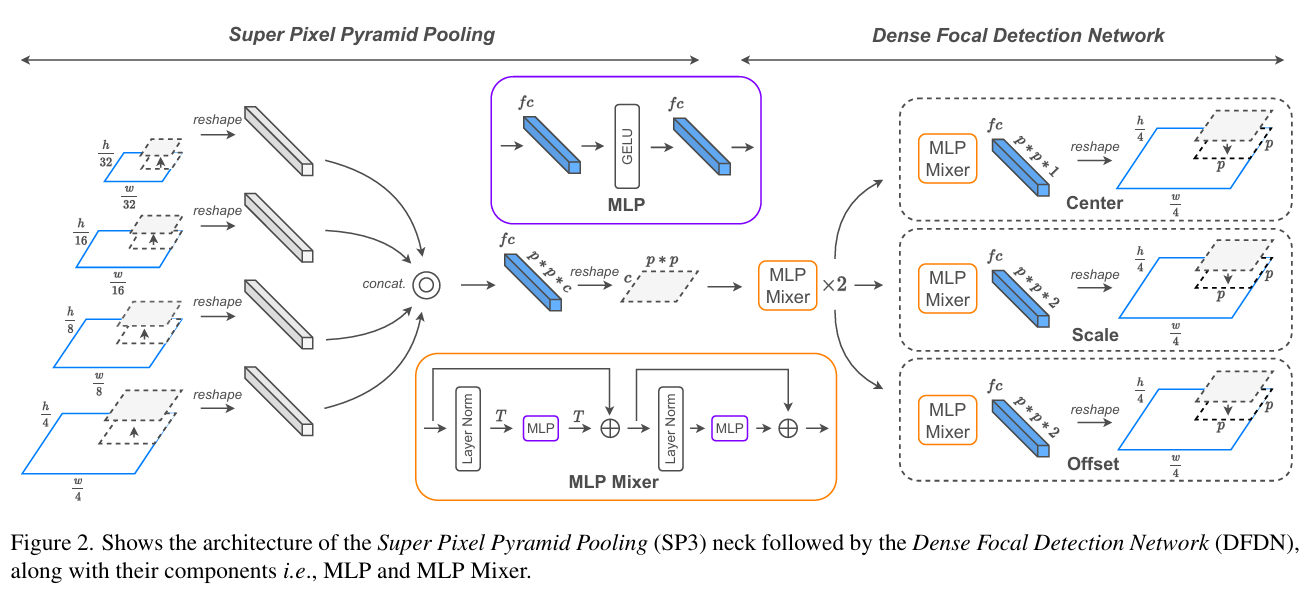 - Components : ConvMLP 기반 백본과 MLPMixer 기반의 검출 헤드를 사용. 이 모델은 입력된 다양한 크기의 이미지 패치를 처리할 수 있으며, 피라미드 네트워크 대신 SP3를 사용하여 네트워크의 가벼움을 유지