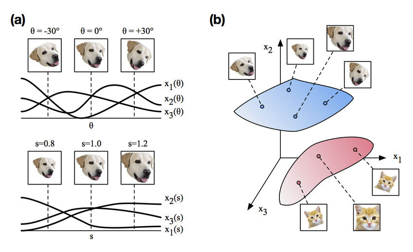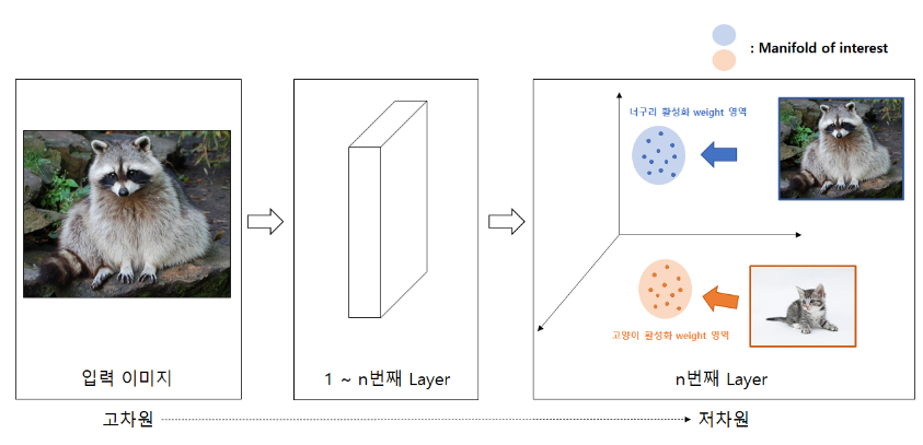 어떤 네트워크에 이미지가 입력된 모습을 생각해보자. 이때 n번째 layer에서는 입력이미지의 특징들이 저차원의 특정 영역에서 활성화된다. 이렇게 저차원에서 특징들이 mapping(활성화)되는 영역이 생기는 것을 manifold of interest를 구성한다고 한다.