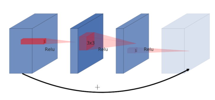 - 처음에 들어오는 입력은 채널이 많은 wide한 형태이고 1x1 convolution을 이용하여 채널을 줄여 다음 layer에서 bottleneck을 만든다.